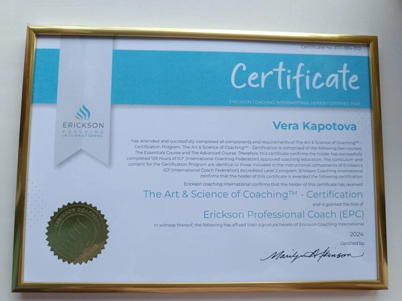 - Erickson Coaching International, программа Art & Science of Coaching™, Erickson Professional Coach, 2024 г.