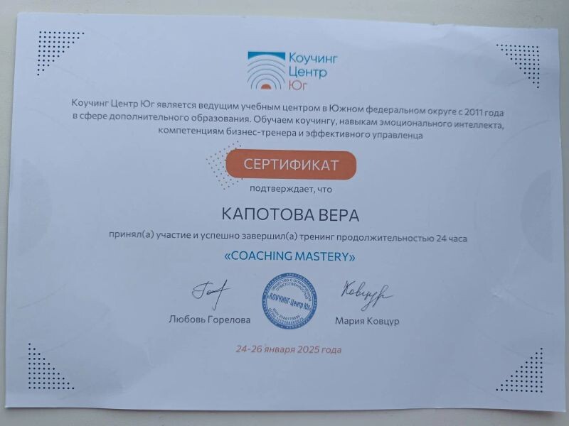 - ООО «Коучинг-центр Юг», тренинг Coaching mastery, 2025 г.