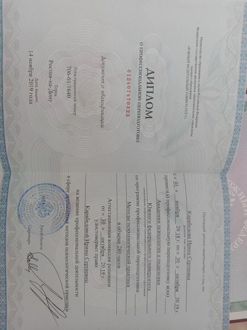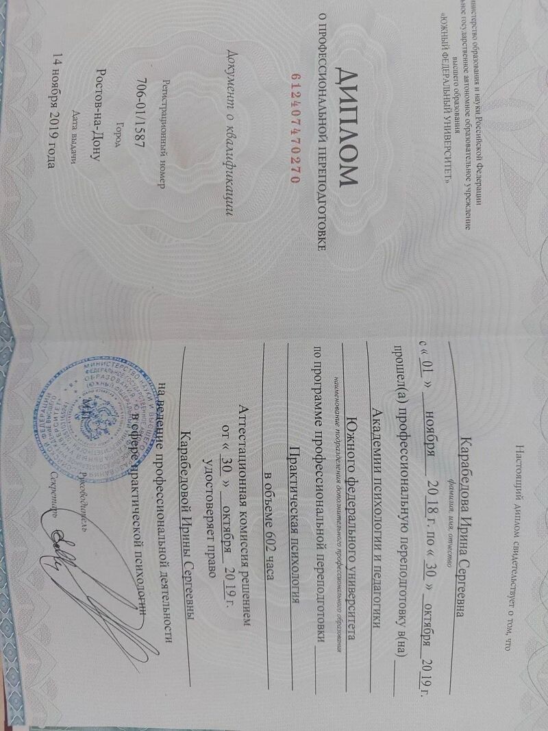 - Южный федеральный университет, академии психологии и педагогики, программа профессиональной подготовки «Практическая психология», 2018–2019 гг.