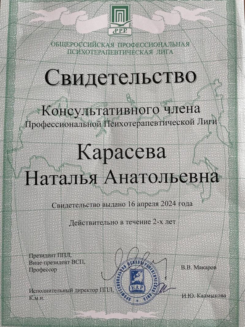 - Общероссийская профессиональная психотерапевтическая лига, свидетельство консультативного члена (действительно до 16.04.2026), 2024 г.