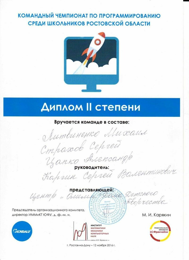 - Ростовский государственный педагогический институт, квалификация – учитель физики и астрономии, 1984 г.