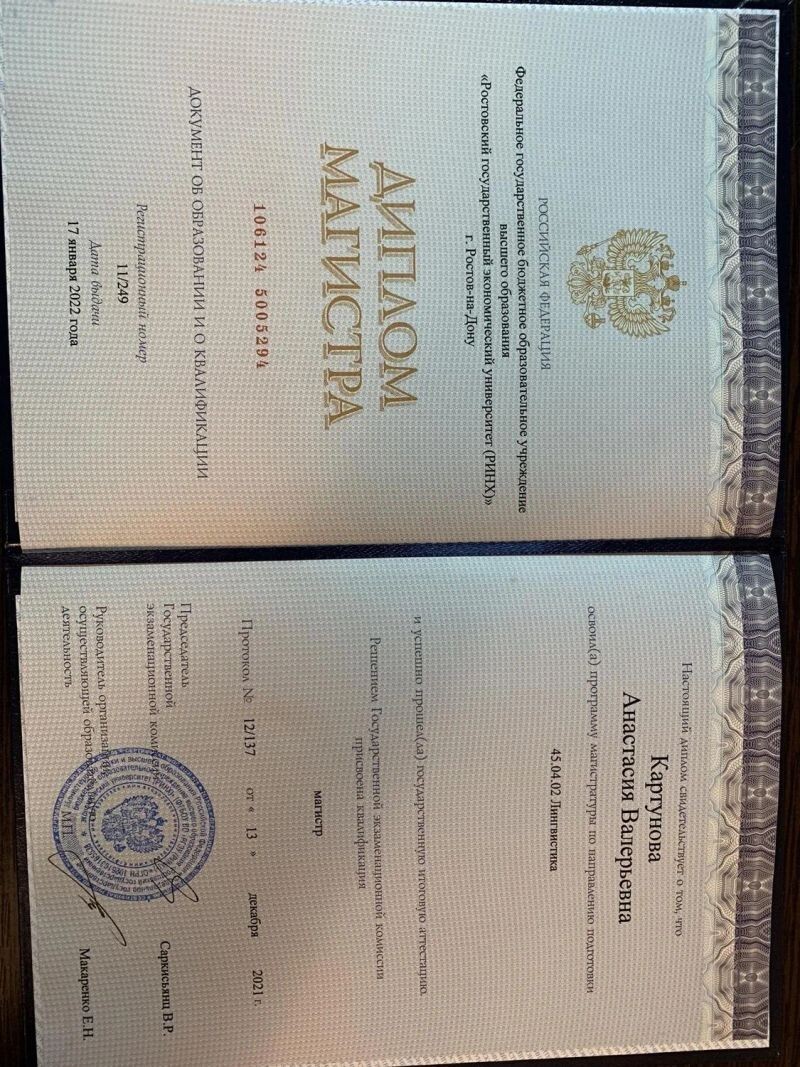 - Федеральное государственное бюджетное образовательное учреждение высшего образования «Ростовский государственный экономический университет (РИНХ)» г.Ростов-на-Дону . Освоила программу магистратуры по направлению подготовки Лингвистика,квалификация магистр, 2019–2022 гг.