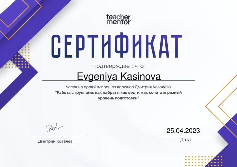 - Teacher mentor, воркшоп Дмитрия Ковалёва «Работа с группами: как набрать, как вести, как сочетать разный уровень подготовки», 2023 г.