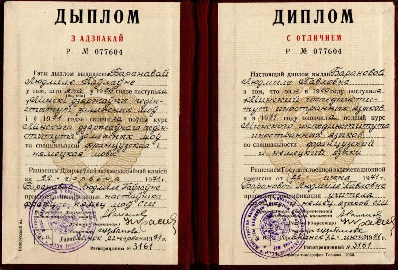 - Минский государственный педагогический институт иностранных языков, специальность «французский и немецкий языки», диплом с отличием, 1966–1971 гг.