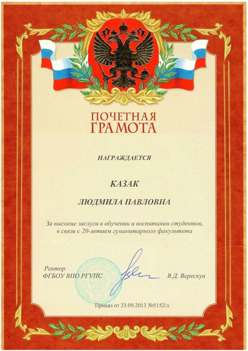- РГУПС, почётная грамота за высокие заслуги в обучении и воспитании студентов, 2013 г.