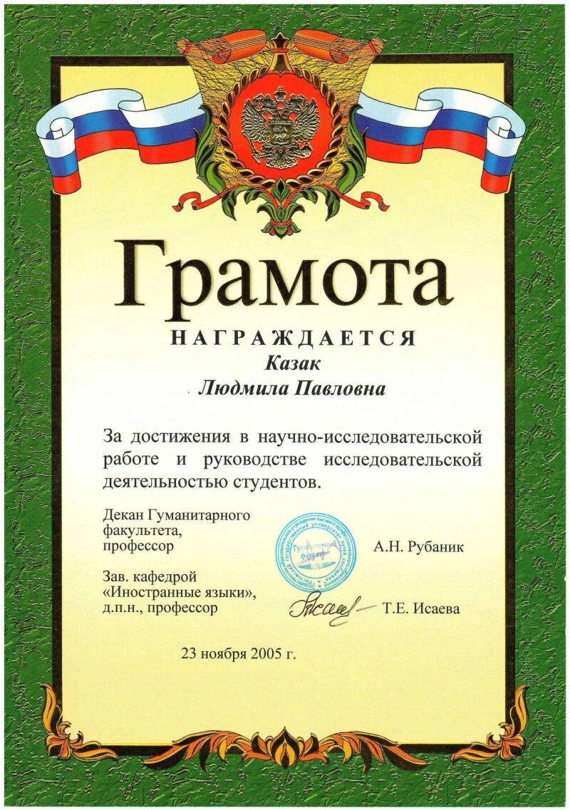 - РГУПС, грамота за достижения в научно-исследовательской работе и руководстве исследовательской деятельностью студентов, 2005 г.