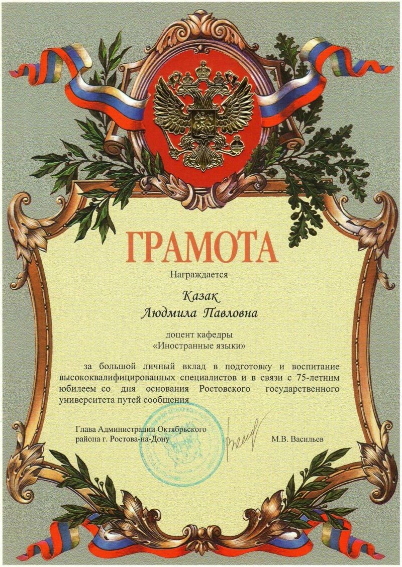 - Администрация Октябрьского р-на г. Ростов-на-Дону, грамота за большой личный вклад в подготовку и воспитание высококвалифицированных специалистов, 2004 г.
