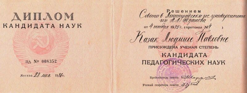 - Ленинградский государственный университет имени А.А. Жданова, кандидат педагогических наук, 1986 г.