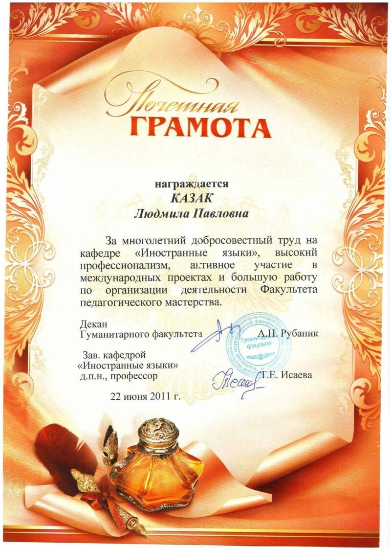 - РГУПС, почётная грамота за многолетний добросовестный труд на кафедре «Иностранные языки», высокий профессионализм, активное участие в международных проектах и большую работу по организации деятельности факультета педагогического мастерства, 2011 г.