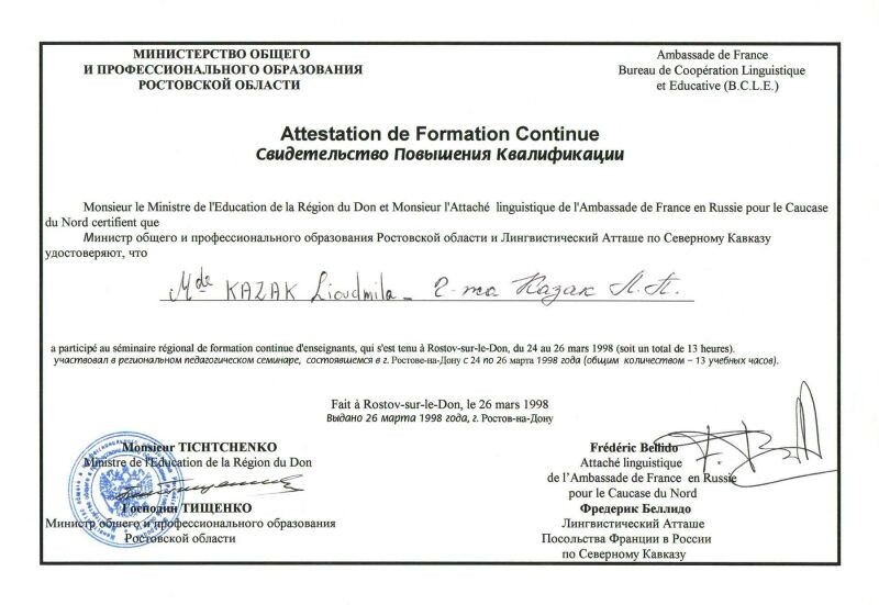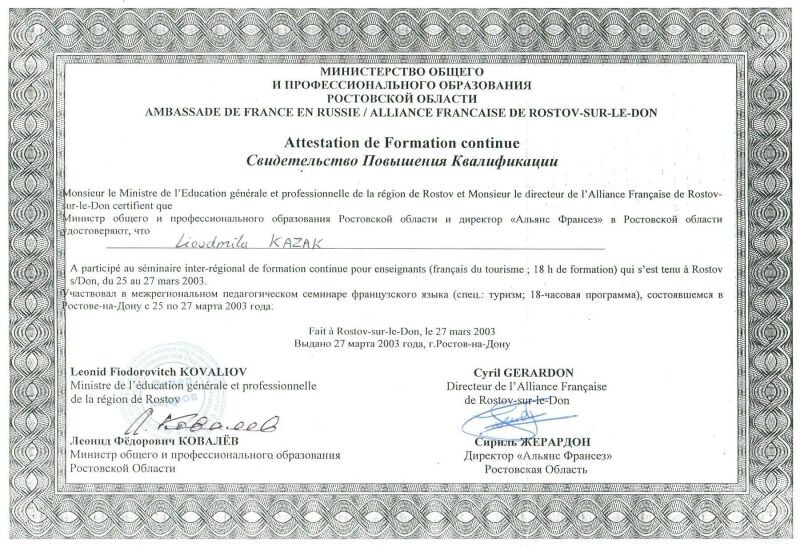 - Министерство общего и профессионального образования Ростовской области, свидетельство повышения квалификации, межрегиональный педагогический семинар французского языка, 2003 г.