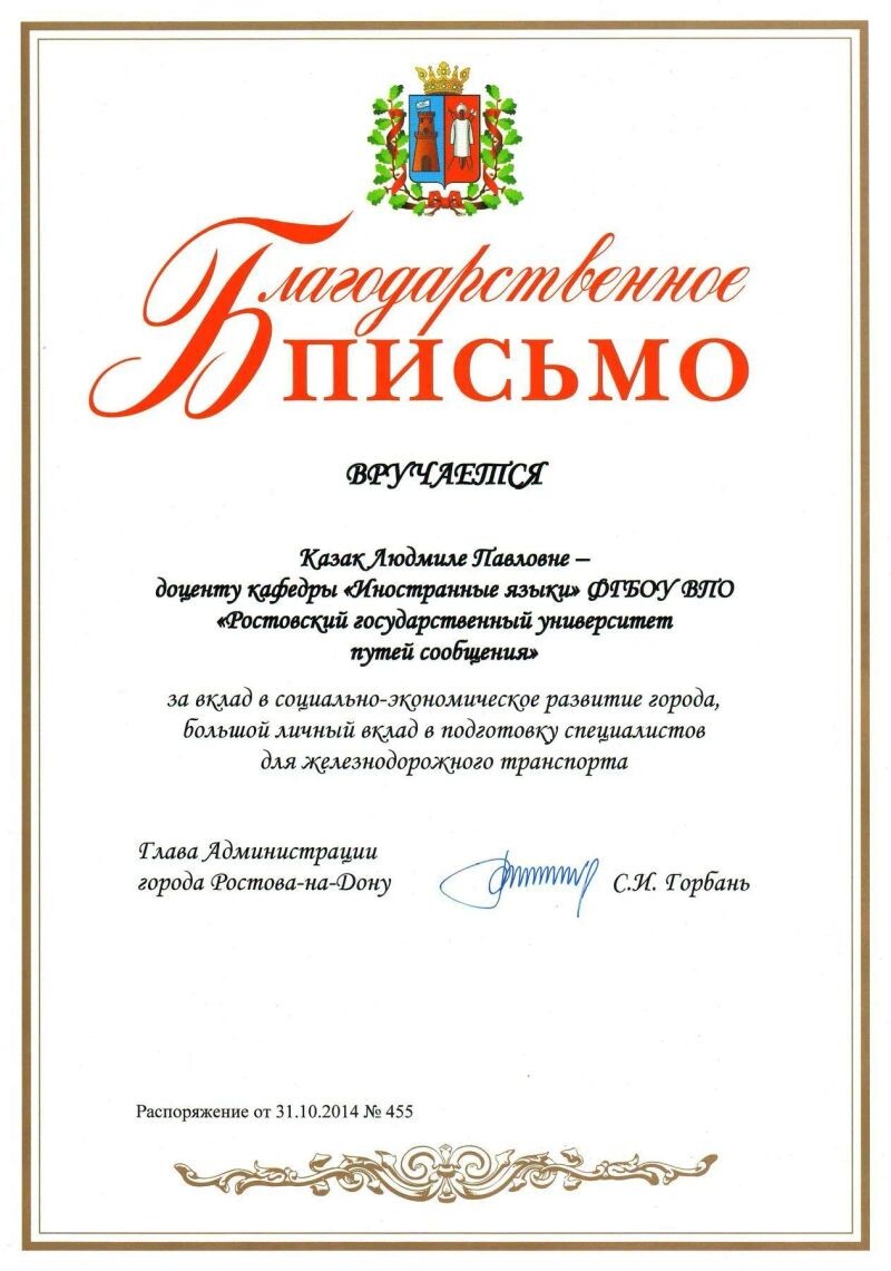 - Администрация г. Ростов-на-Дону, благодарственное письмо за вклад в социально-экономическое развитие города, большой личный вклад в подготовку специалистов для железнодорожного транспорта, 2014 г.
