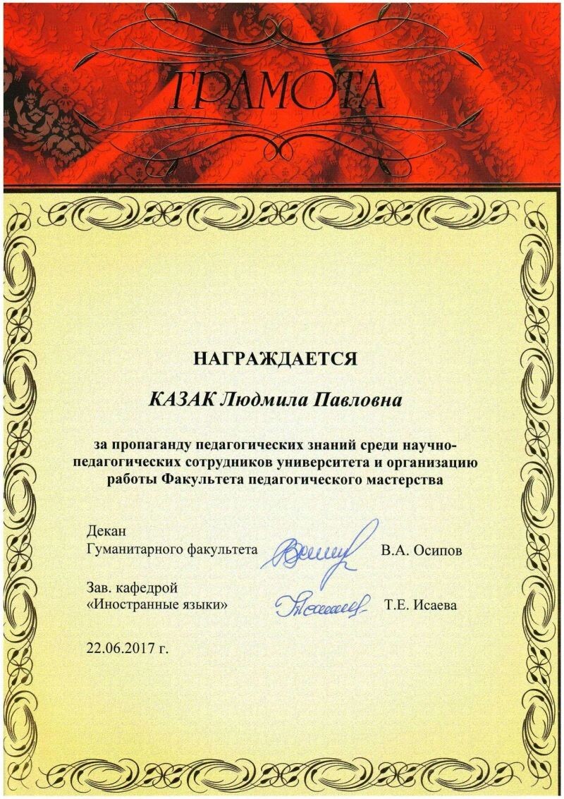 - Гуманитарный факультет, грамота за пропаганду педагогических знаний среди научно-педагогических сотрудников университета и организацию работы факультета педагогического мастерства, 2017 г.
