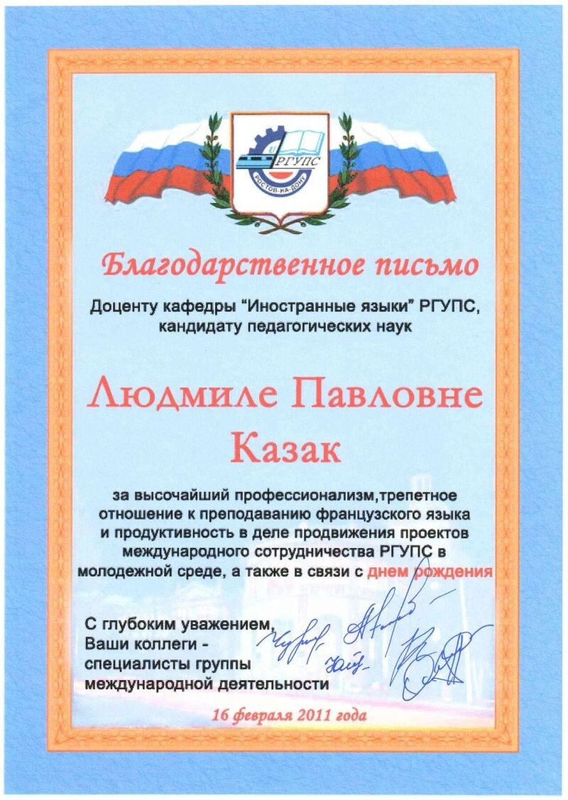 - РГУПС, благодарственное письмо за высочайший профессионализм, трепетное отношение к преподаванию французского языка и продуктивность в деле продвижения проектов международного сотрудничества, 2011 г.