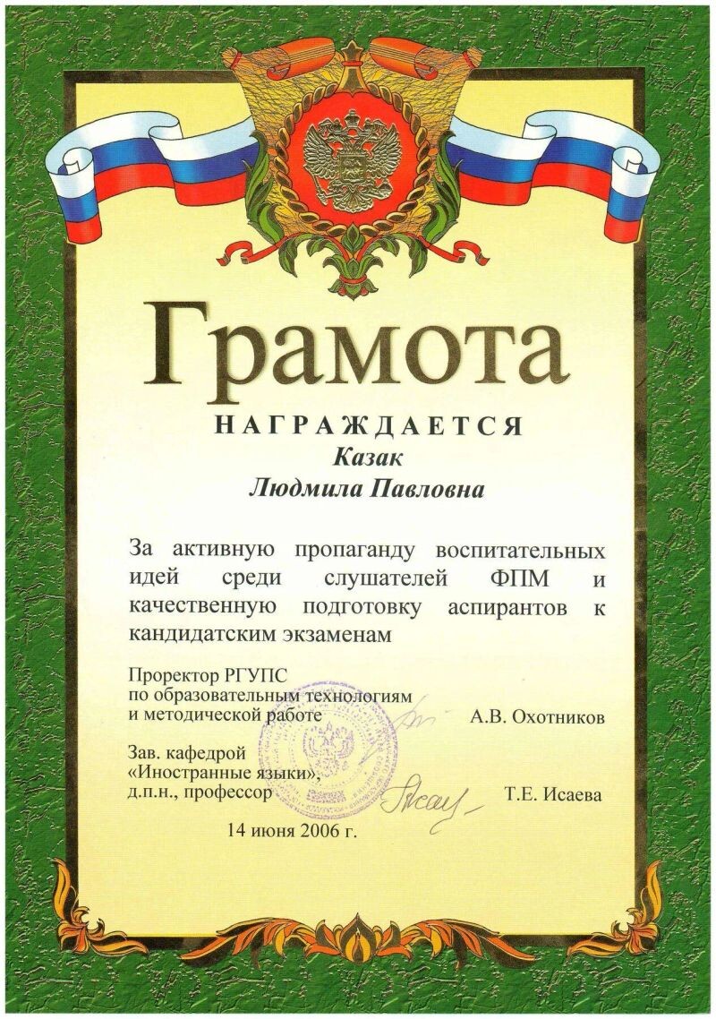 - РГУПС, грамота за активную пропаганду воспитательных идей среди слушателей ФПМ и качественную подготовку аспирантов к кандидатским экзаменам, 2006 г.