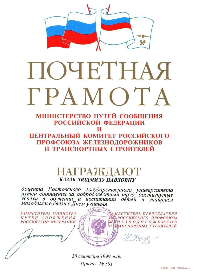- Министерство ПС РФ, почётная грамота за добросовестный труд, достигнутые успехи в обучении и воспитании детей и учащейся молодежи в связи с днём учителя, 1999 г.