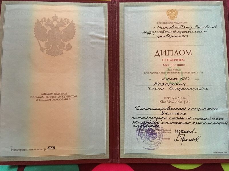 - Ростовский государственный педагогический университет, факультет иностранных языков, специальность – учитель немецкого и английского языков, 1996 г.