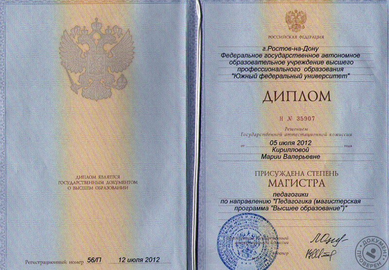 - Южный федеральный университет, факультет педагогики, специальность – магистр педагогики, 2012 г.