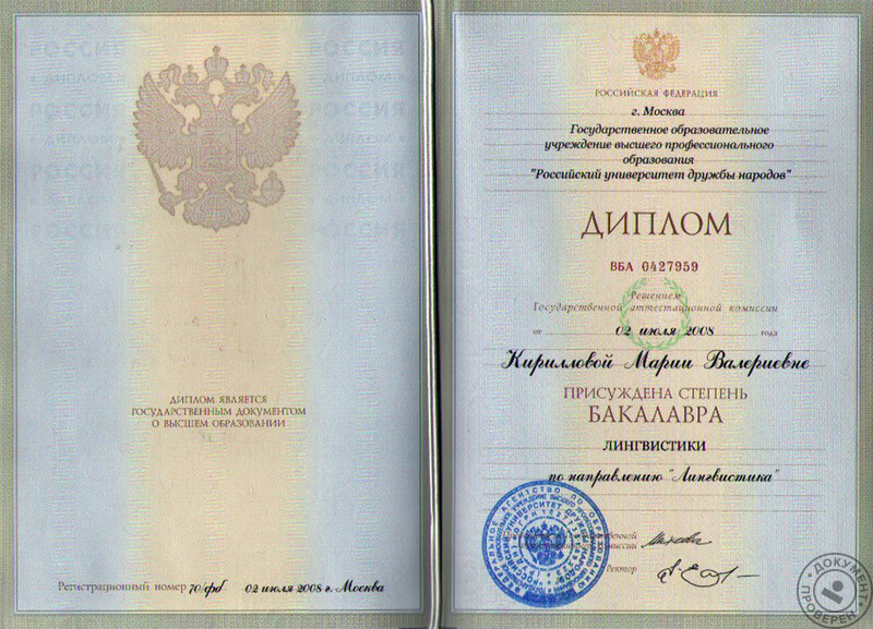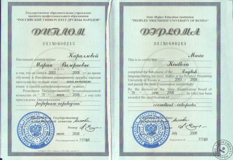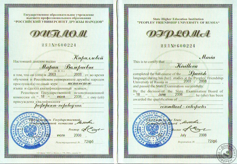 - Российский университет дружбы народов (г. Москва), факультет лингвистики, квалификация – лингвист, переводчик с испанского и английского языков, 2008 г.