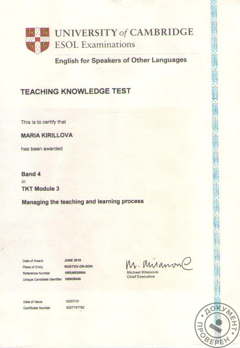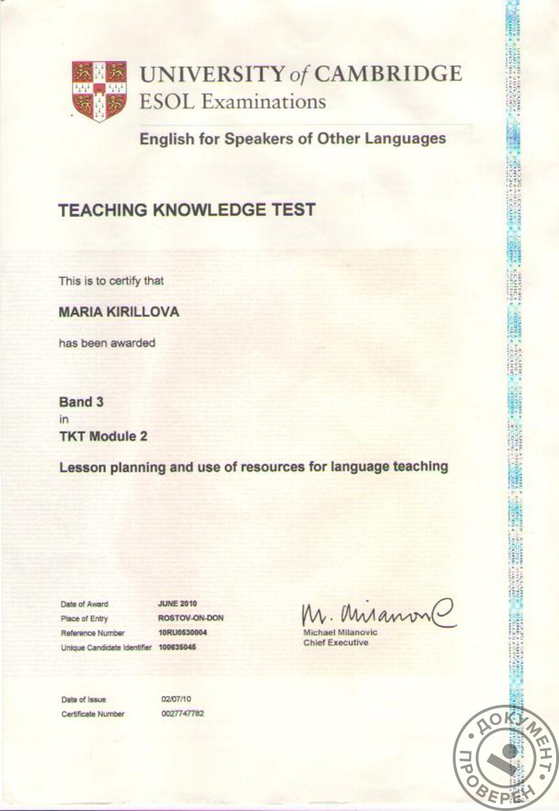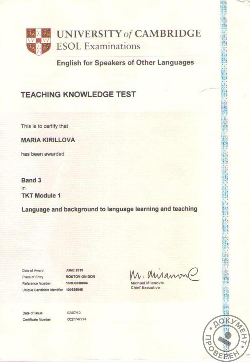 - Кембриджские сертификаты ESOL и TKT (методика преподавания английского языка как иностранного), 2011 г.