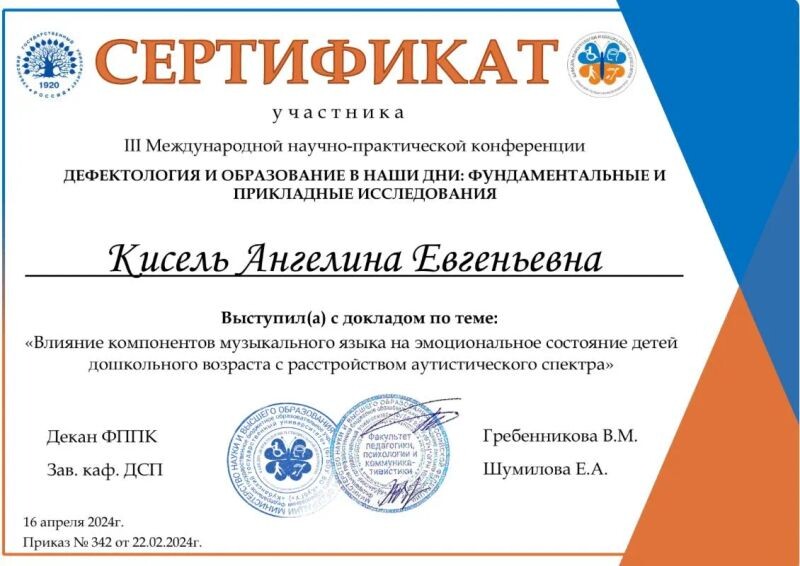 - III Международная научно-практическая конференция «Дефектология и образование в наши дни: фундаментальные и прикладные исследования», доклад «Влияние компонентов музыкального языка на эмоциональное состояние детей с расстройством аутистического спектра», 2024 г.