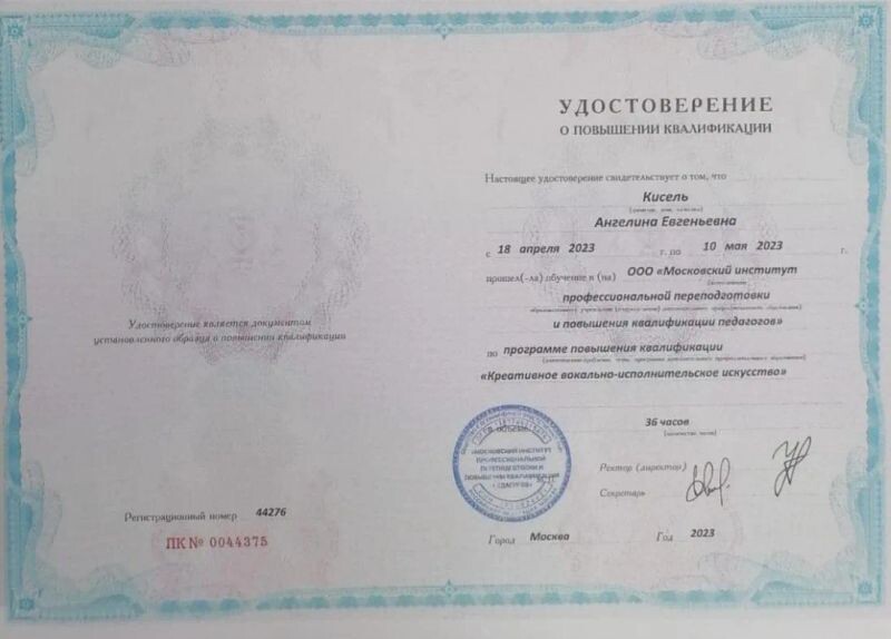 - Московский институт профессиональной переподготовки и повышения квалификации педагогов, программа «Креативное вокально-исполнительское искусство», 2023 г.