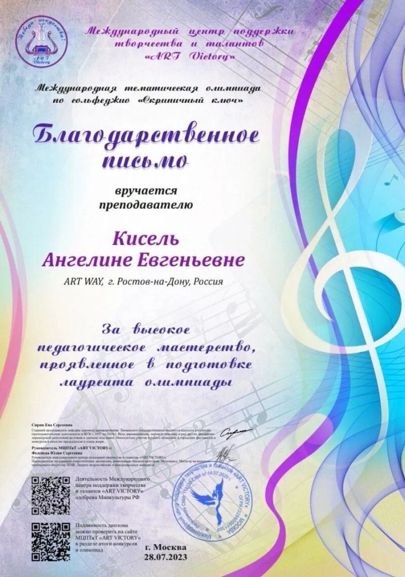 - Международная тематическая олимпиада по сольфеджио «Скрипичный ключ», благодарственное письмо за высокое педагогическое мастерство в подготовке лауреата олимпиады, 2023 г.