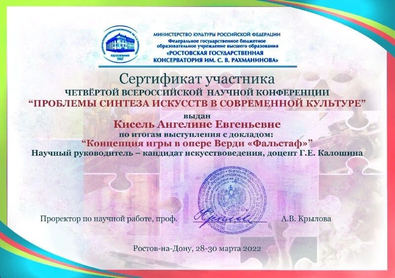 - Ростовская государственная консерватория им. С. В. Рахманинова, выступление с докладом на Четвёртой всероссийской научной конференции «Проблемы синтеза искусств в современной культуре», 2022 г.