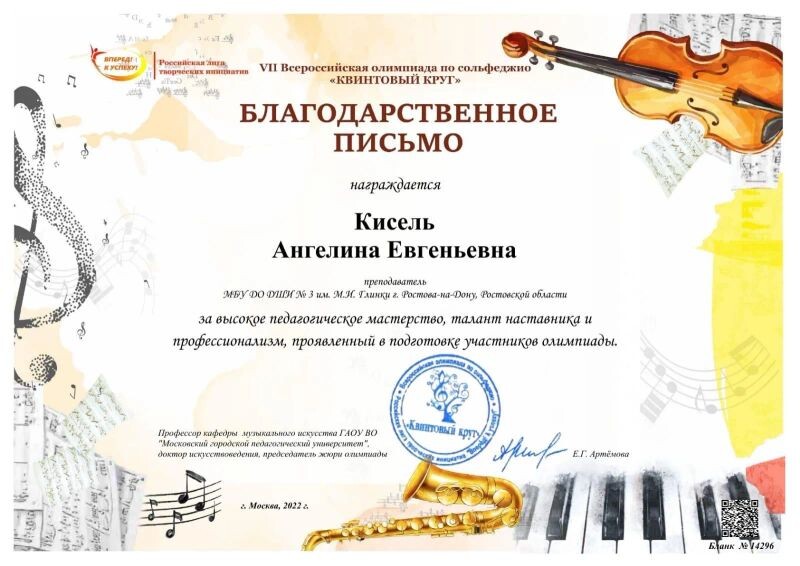 - VII Всероссийская олимпиада по сольфеджио «Квинтовый круг», благодарственное письмо за высокое педагогическое мастерство, талант наставника и профессионализм, проявленный в подготовке участников олимпиады, 2022 г.