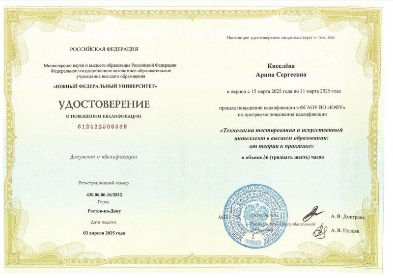 - Южный федеральный университет, технологии тестирования и искусственный интеллект в высшем образовании, 2025 г.