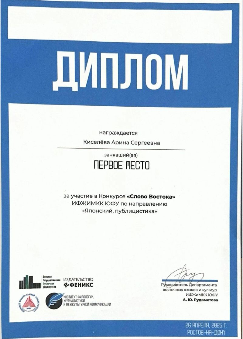 - Конкурс «Слово Востока», 1 место, 2025 г.