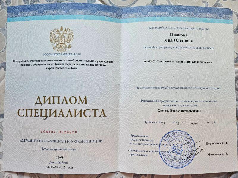 - ЮФУ, специальность «учитель химии», 2014–2019 гг.