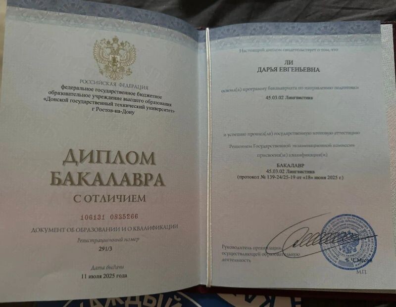 - Донской Государственный Технический Университет. Факультет: Прикладная лингвистика. Направление: Теория и методика преподавания иностранных языков, 2021–2025 гг.