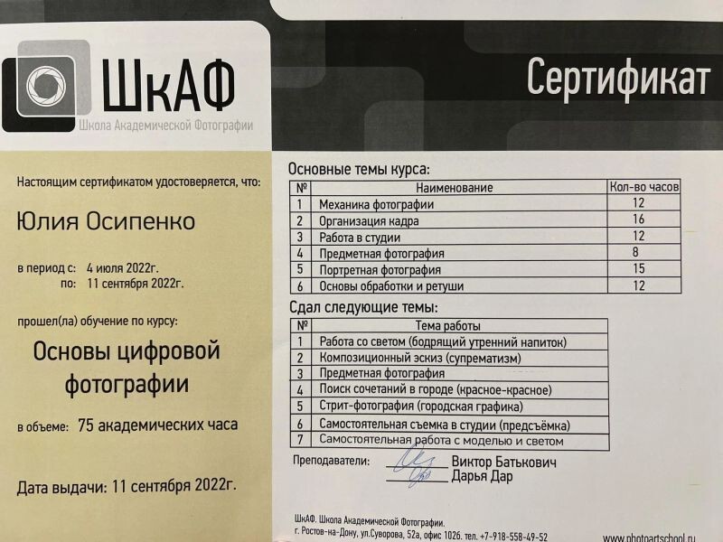 - Школа академической фотографии «ШкАФ», курс «Основы цифровой фотографии», 2022 г.