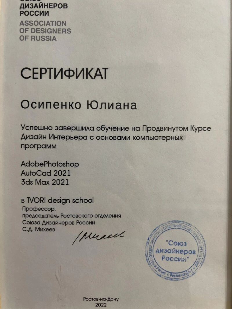 - Школа дизайна интерьера «Твори», продвинутый курс «Дизайн интерьера» (с основами компьютерных программ AdobePhotoshop, AutoCad 2021, 3ds Max 2021), 2022 г.