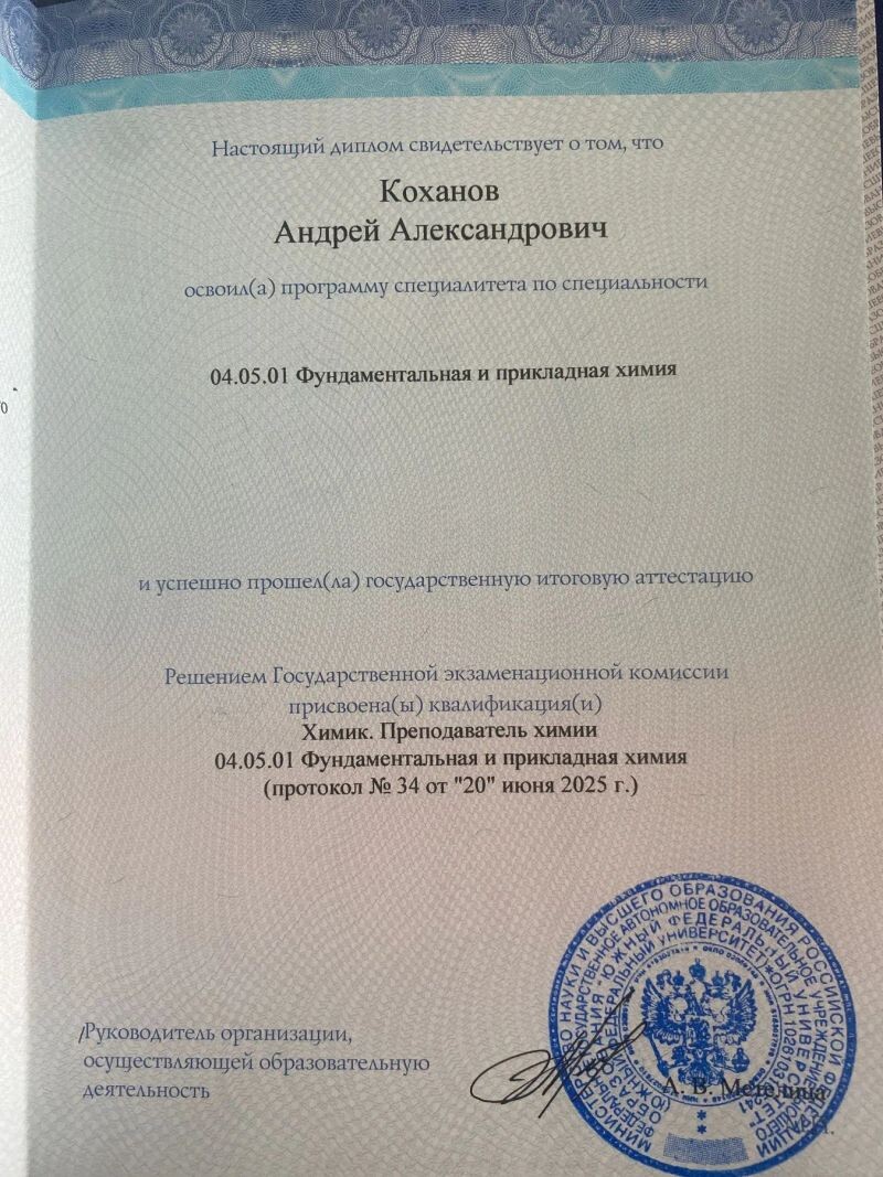 - Южный Федеральный университет, химический факультет, 2020–2025 гг.