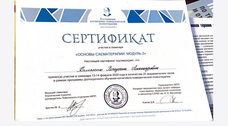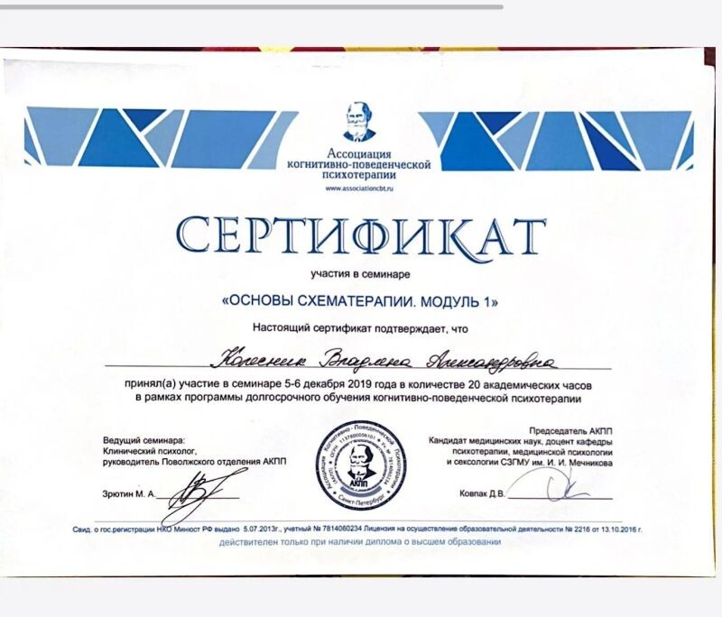 - Ассоциация когнитивно-поведенческой психотерапии, семинар «Основы схема-терапии. Модуль 2», 2020 г.
