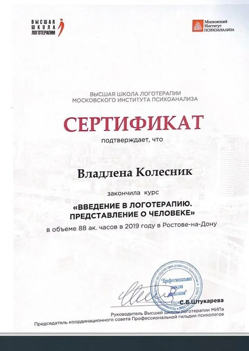 - Московский институт психоанализа. Введение в логотерапию. Представление о человеке. 88 часов, 2019 г.