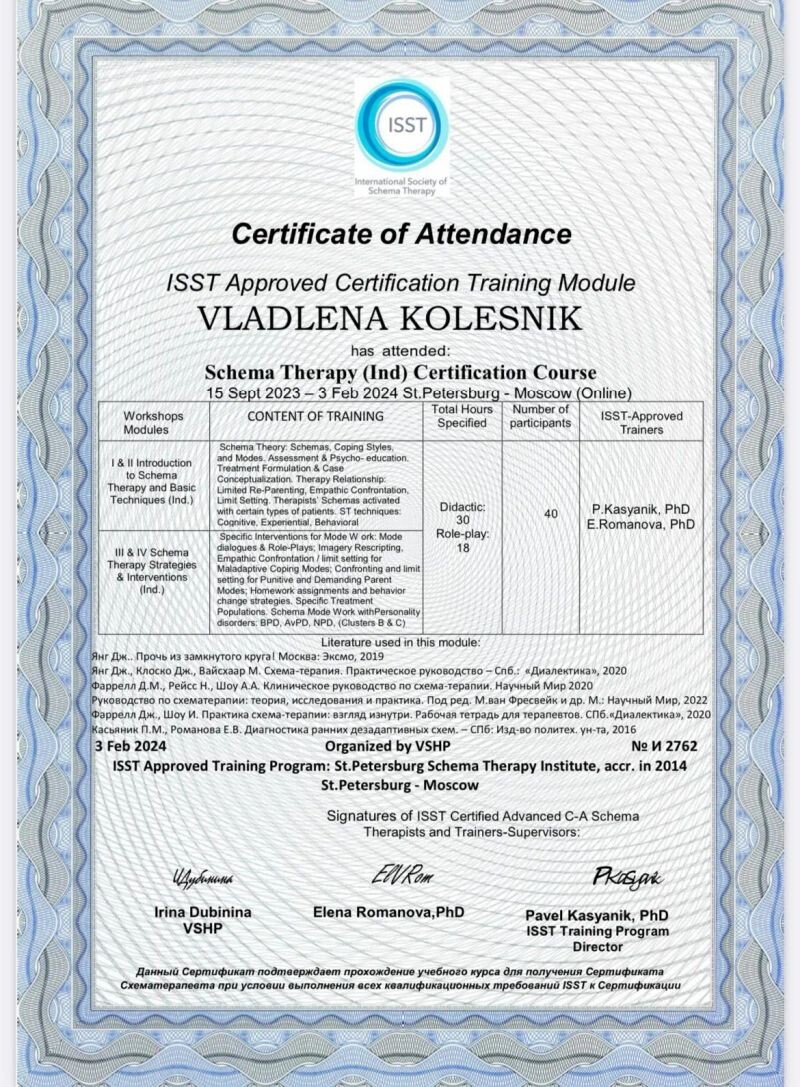 - ISST, Pavel Kasyanik, Elena Romanova, Schema Therapy certification course, 2023–2024 гг.