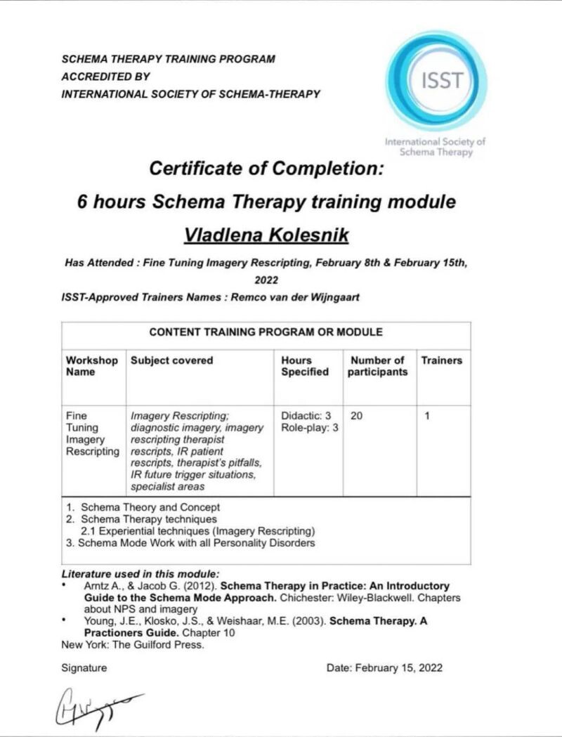 - ISST, 6 hours Schema Therapy training module, 2022 г.
