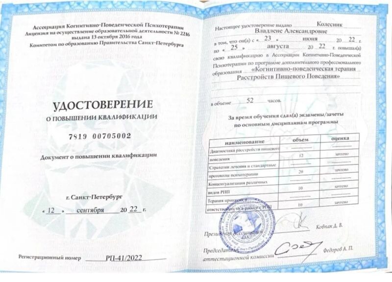 - Ассоциация когнитивно-поведенческой психотерапии, повышение квалификации по программе «Когнитивно-поведенческая терапия расстройств пищевого поведения», 2022 г.