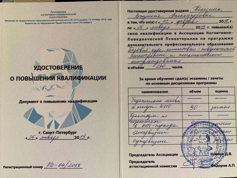 - АКПП, повышение квалификации по программе «Базовый курс когнитивно-поведенческой психотерапии и психологического консультирования», 230 ч, 2018–2019 гг.