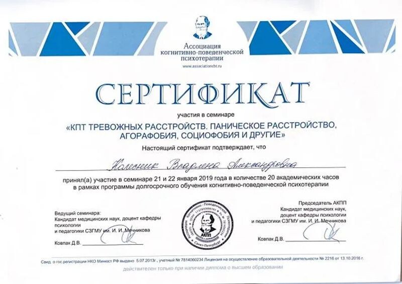 - Ассоциация когнитивно-поведенческой психотерапии, семинар «КПТ тревожных расстройств. Паническое расстройство, агорафобия, социофобия и другие», 2019 г.