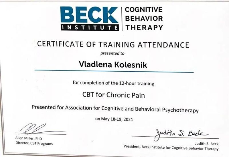 - Beck Institute, 12-hour training CBT for chronic pain, 2021 г.