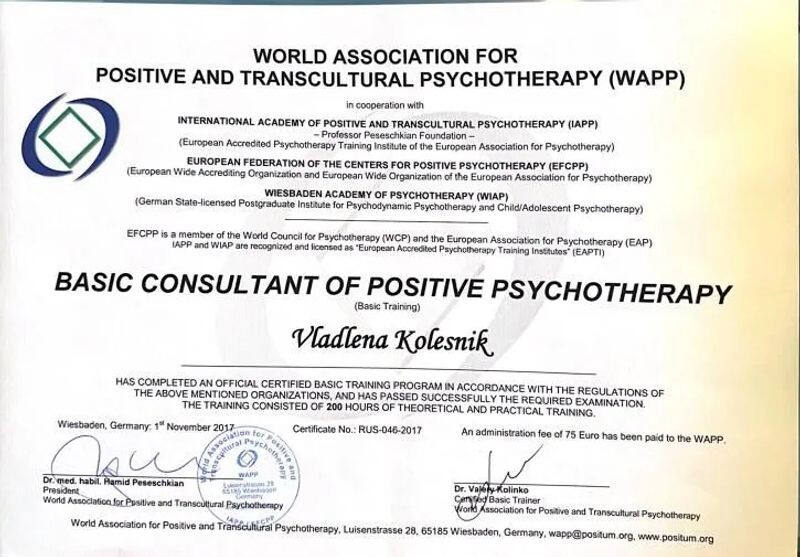 - WAPP, Wiesbaden, Germany, базовый консультант в методе Позитивная Психотерапия, 200 часов, 2016–2017 гг.