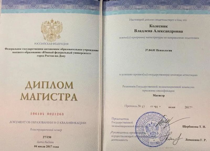 - Южный федеральный университет, магистр психологии, 2017 г.
