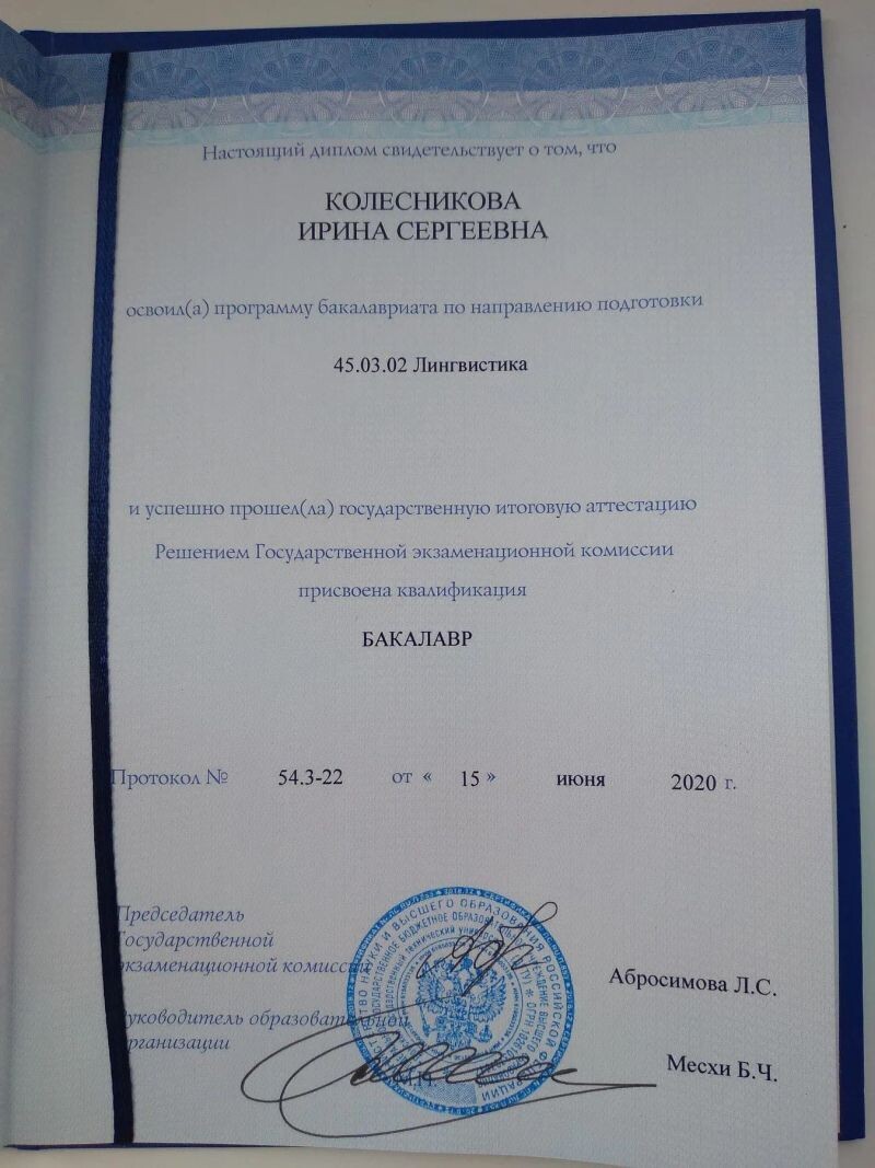 - Донской государственный технический университет (ДГТУ), социально-гуманитарный факультет, лингвистика (теория и методика преподавания иностранных языков и культур), 2016–2020 гг.