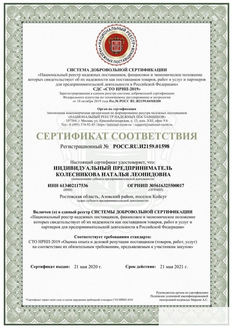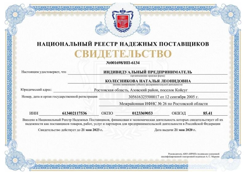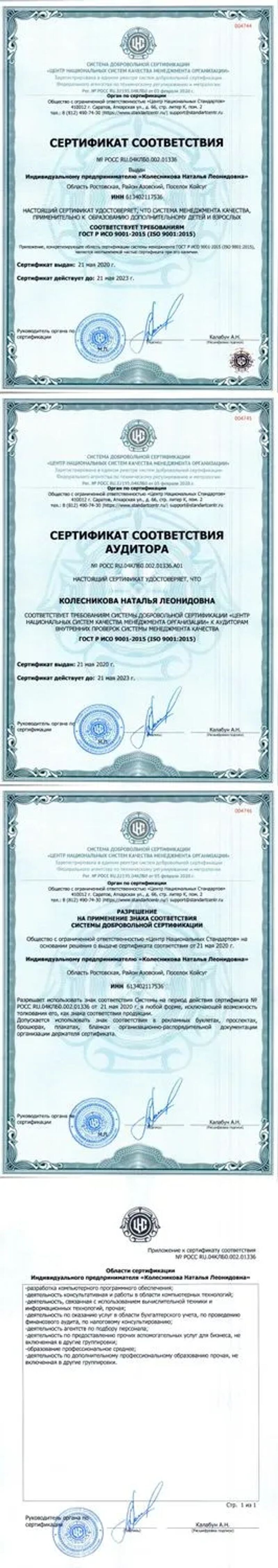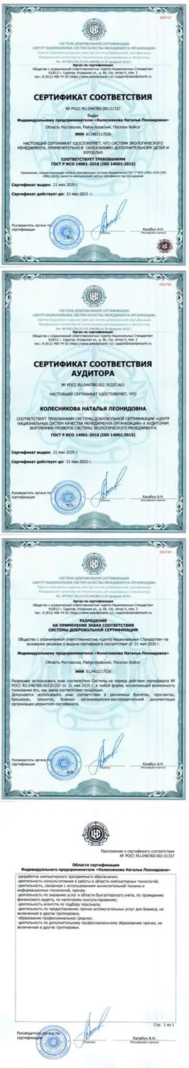 - Сертификат соответствия ИП применительно к дополнительному образованию детей и взрослых, 2020 г.