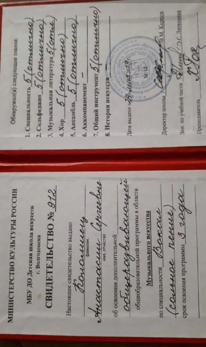 - МБУ ДО «Детская школа искусств г. Волгодонска», вокал (сольное пение), 2016–2019 гг.