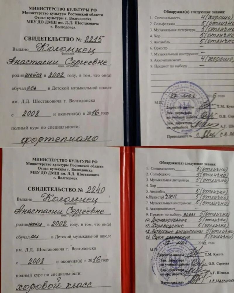 - ДМШ им. Д.Д. Шостаковича г. Волгодонска, фортепиано, хоровой класс, 2008–2016 гг.