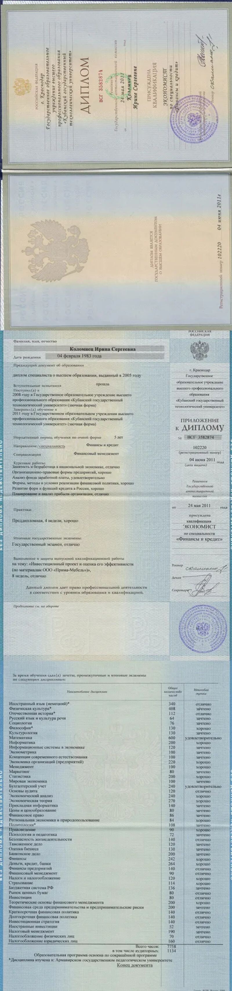 - Кубанский государственный технологический университет, экономист, финансы и кредит, 2009–2011 гг.